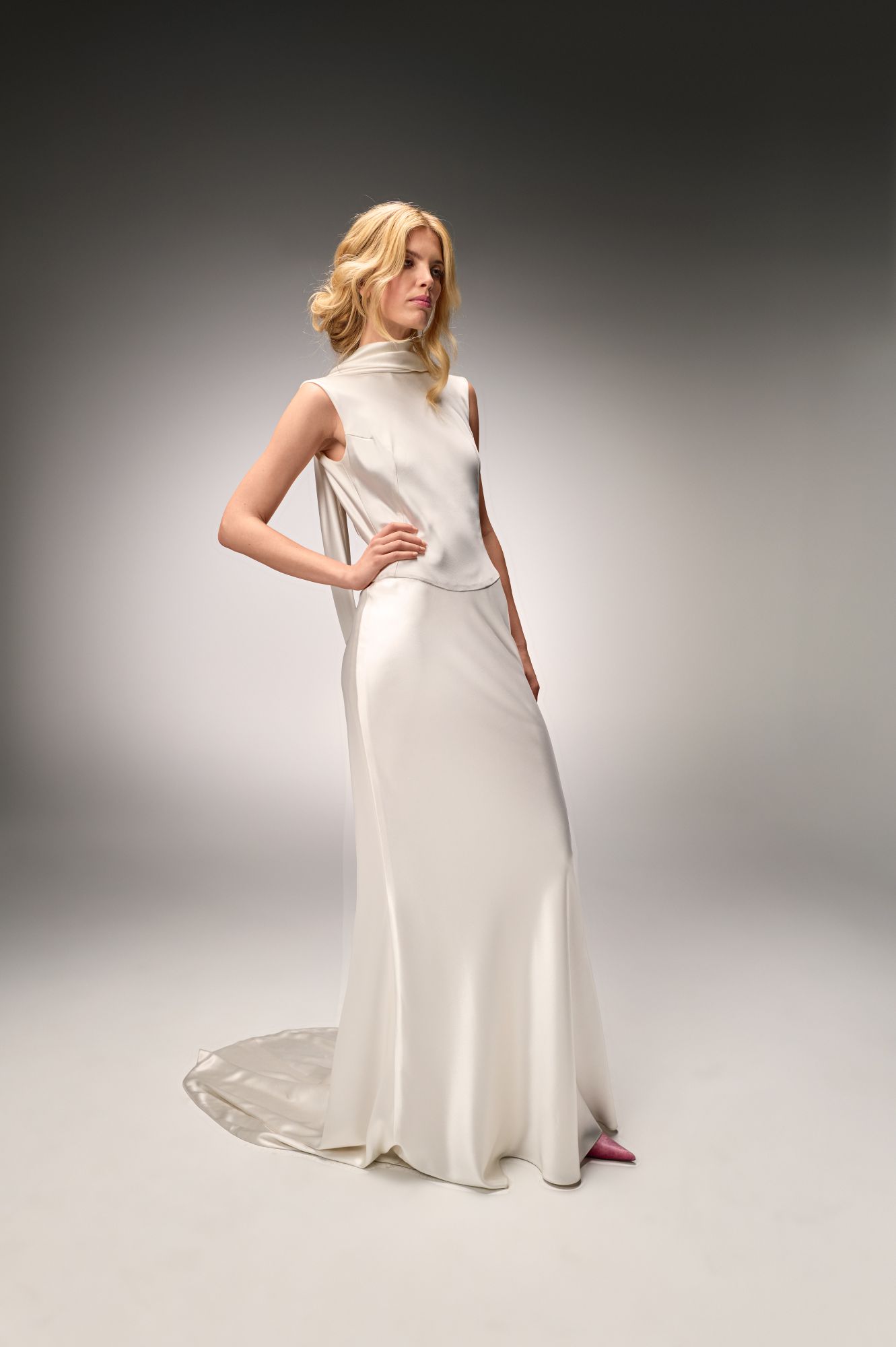 Price available on requestSilk Charmeuse High-Neck, Drop-Waist Bias Gown with Dramatic Low Back & Plunge Drape