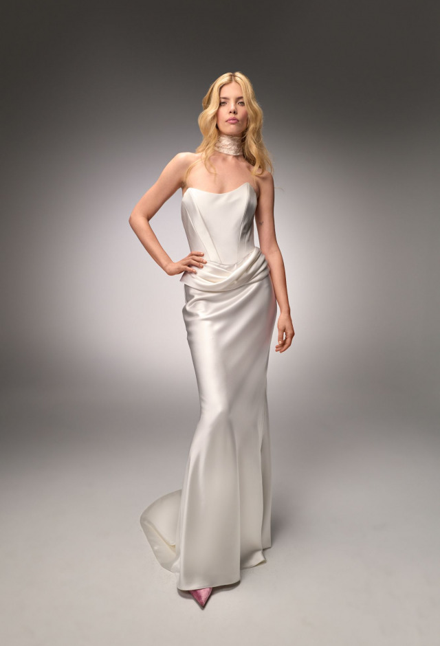 Price available on requestCrafted from luxurious Mikado fabric, the long corset with a straight neckline extends into the skirt with rich, gathered pleats, adding dramatic volume. Made of four structured panels, the delicately ruched fabric enhances the sculpted silhouette. A long train completes the look, while the clean, modern pearl colour adds a refined touch
