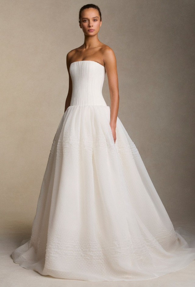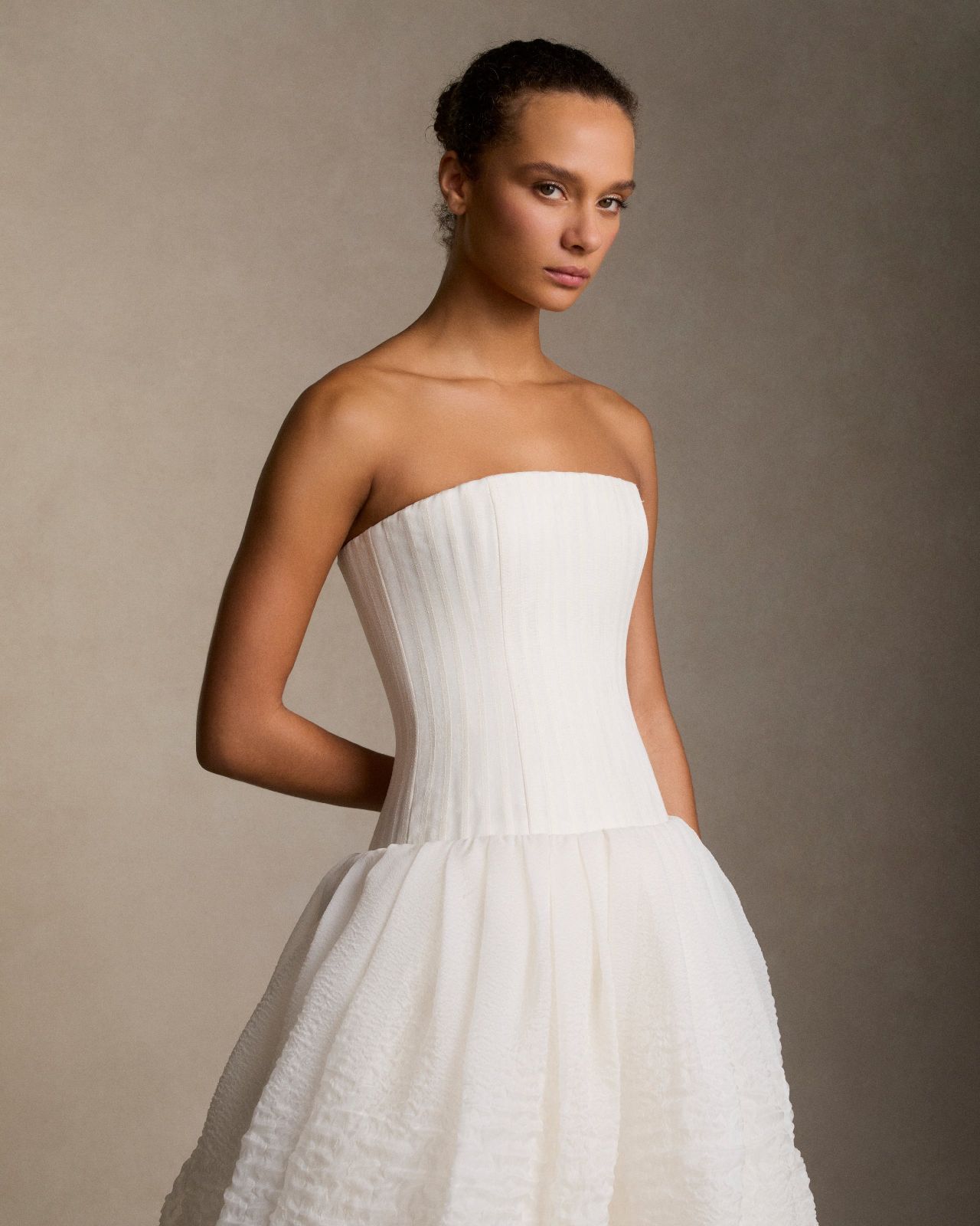 Price available on requestStrapless drop waist silk linen organza ballgown with grosgrain boning detail shaping the bustier. Layered textured cloqué organza drop waist ball skirt with honeycomb lace underlay. Boned internal bustier, internal grosgrain belt and invisible zip closure at centre back.