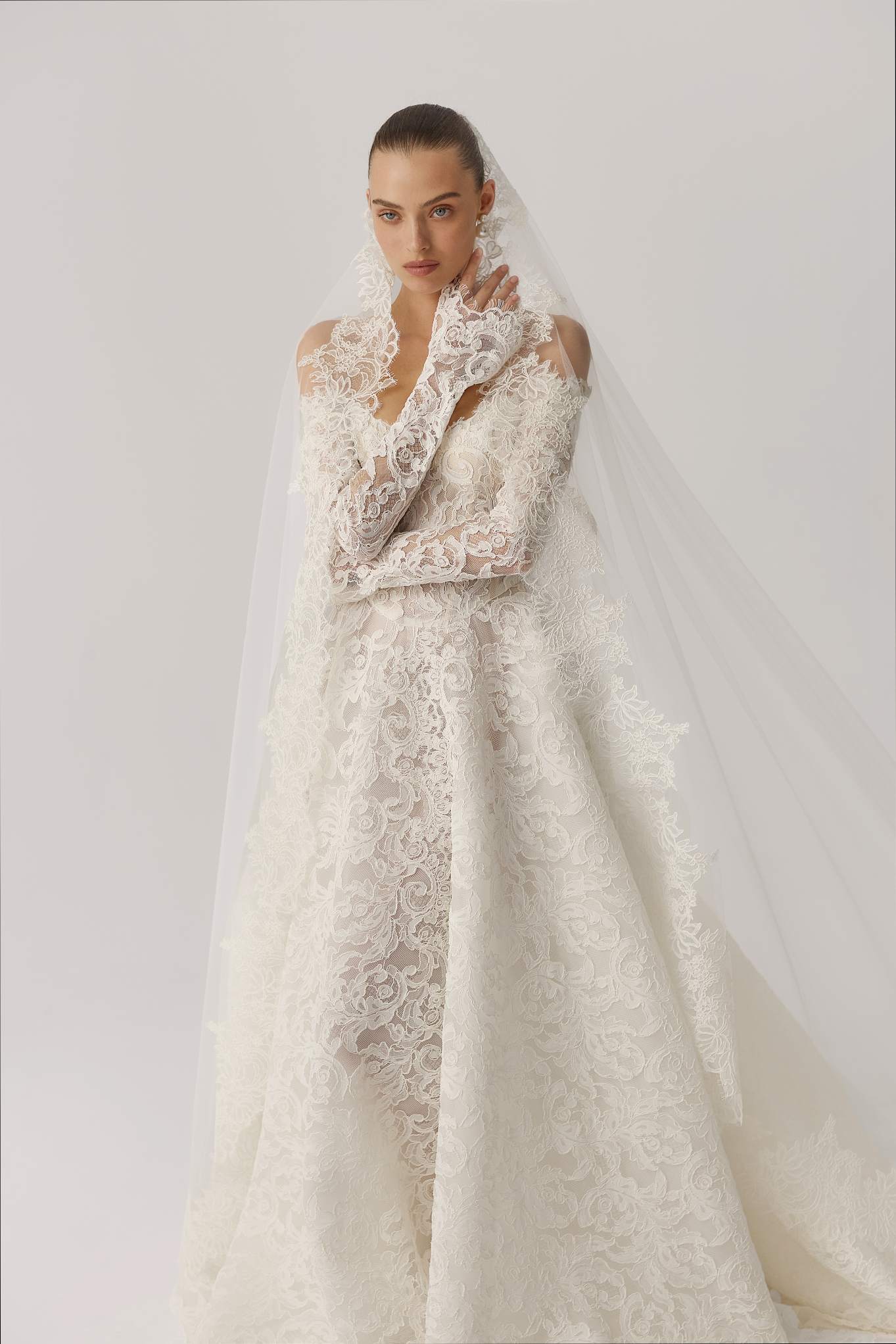 Price available on requestOff the shoulder lace wedding gown from Lihi Hod with delicate extended cuff detail and long dramatic train