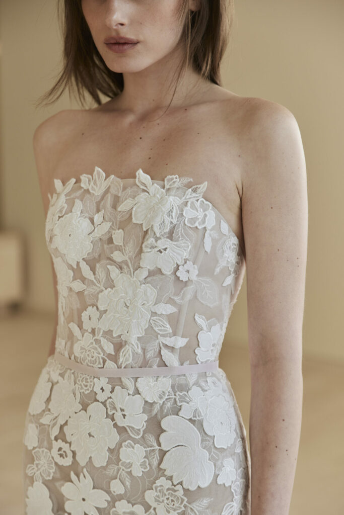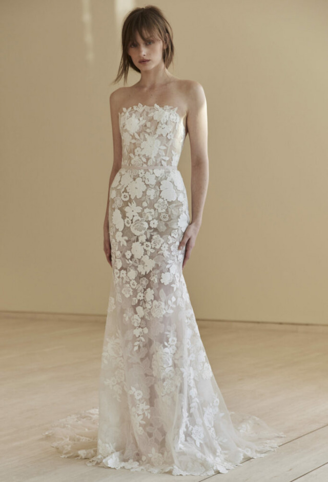 Price available on requestSlim-fitted gown crafted from sheer, embroidered tulle, adorned with cascading 3D floral appliqués that sculpt the body with romantic texture. The strapless neckline frames the décolletage with clean elegance, while the floral motifs appear to bloom organically across the silhouette. This refined design offers a modern take on classic bridal romance—lightweight, ethereal, and effortlessly sophisticated. Peter Langner Mirror of Wishes Wedding Dress