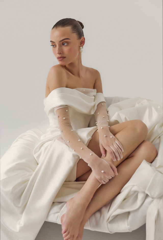 Price available on requestOff the shoulder silk Lihi Hod gown with draped detailing