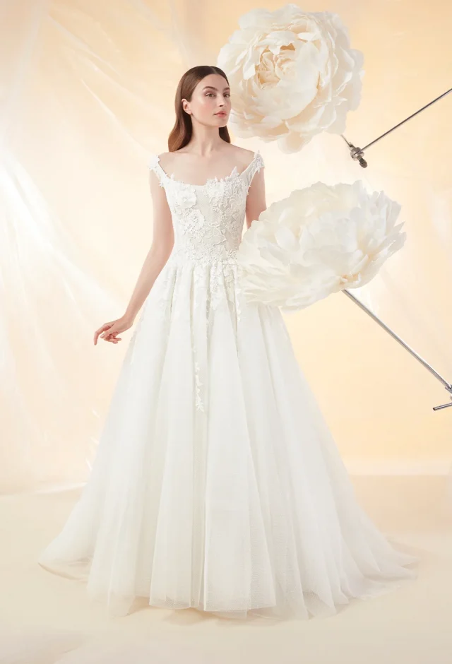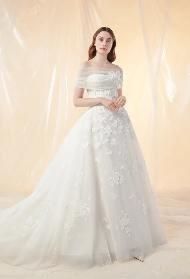Price available on requestUntil Midnight is a regal wedding gown crafted from embroidered tulle, featuring an elegant off-the-shoulder neckline that delicately frames the shoulders and décolleté.