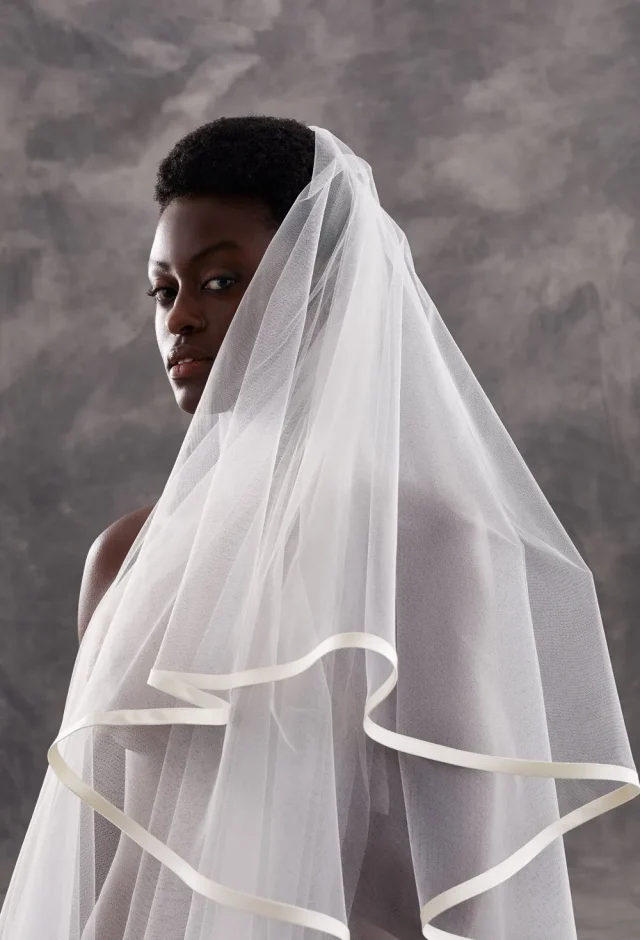 Price available on requestTwo tier silk tulle veil custom made in our in house atelier. Fine edge detail for a touch of minimalist detail. Available single or double tier.