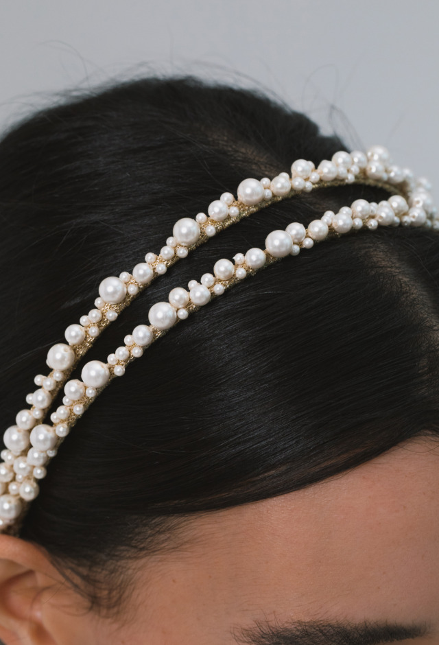 Price available on requestThe Perlita Headband features dual strands of Austrian crystal pearls, hand-embroidered in an organic scattering, like pearls tossed by the sea. Made by hand in New York, the flexible headband base is wrapped by hand with Japanese ribbon.