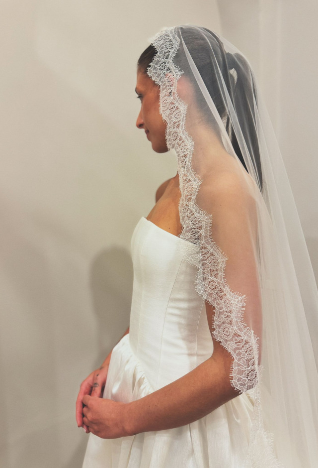 Price available on requestMantilla style single tier veil with delicate Chantilly lace trim.