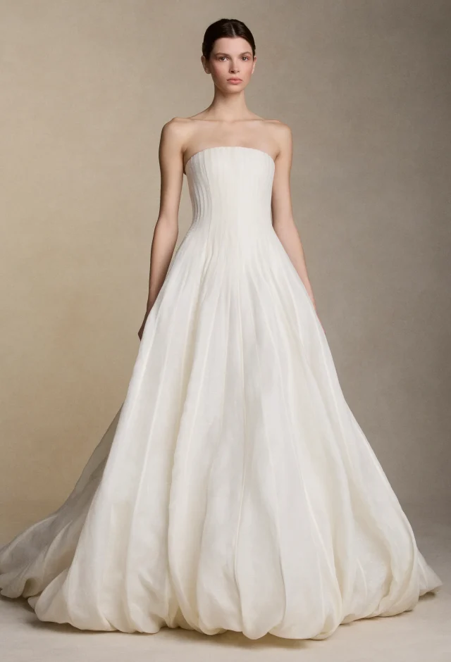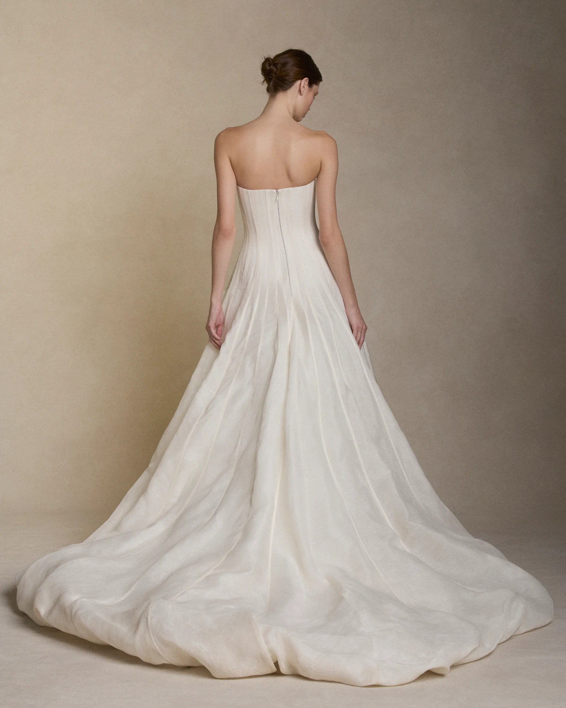 - Danielle Frankel Arabella Wedding DressPrice available on request- Strapless silk linen organza ballgown with dramatic train. Rows of grosgrain boning detail shape the bodice and disperse into undulating panels, finishing with a bubble hem. Boned internal bustier, internal grosgrain belt and invisible zip closure at centre back.