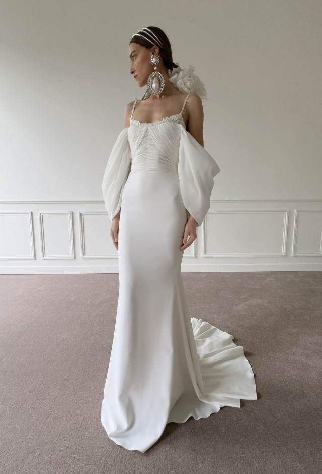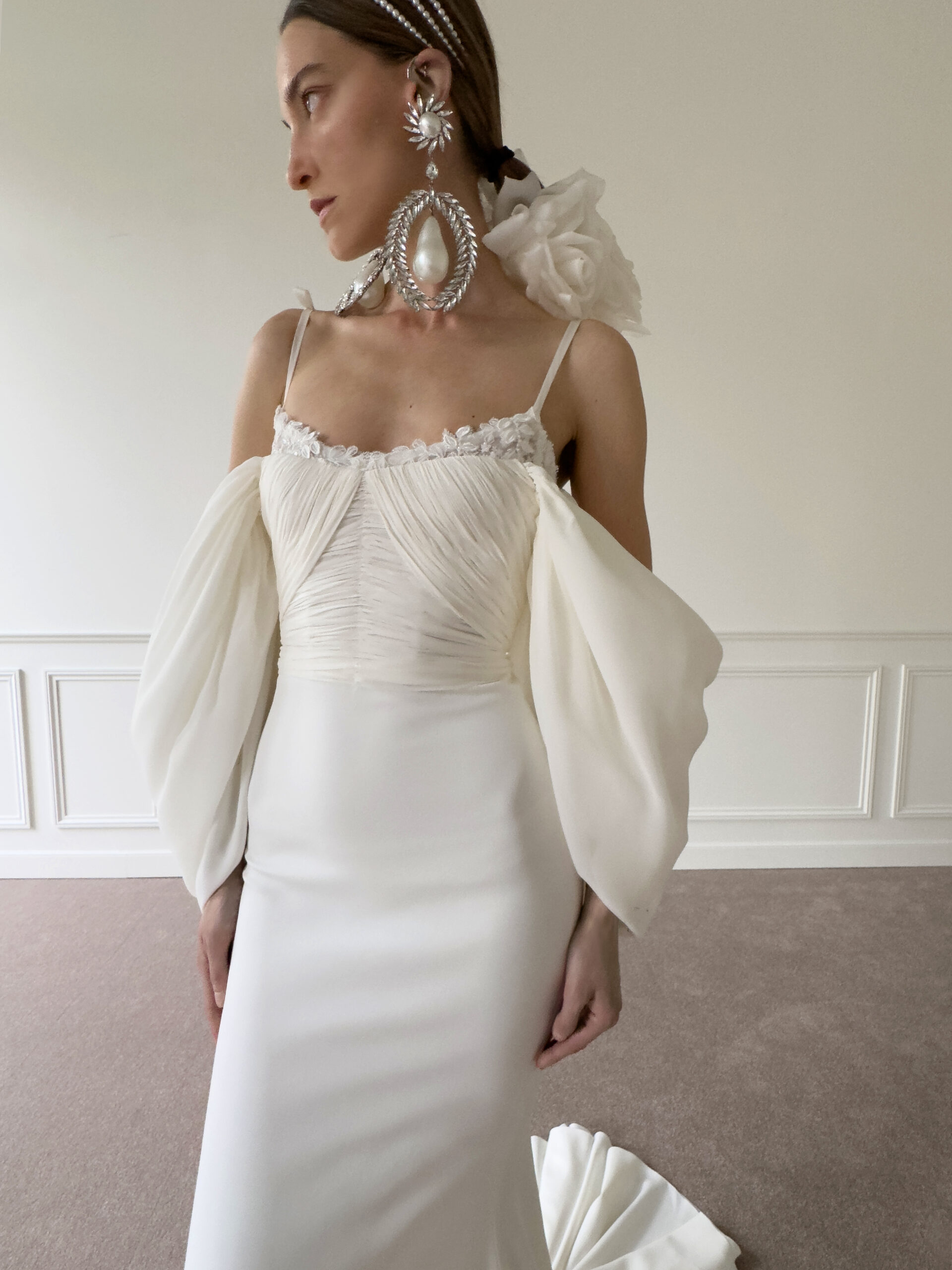 - Giambattista Valli Jullet Wedding DressPrice available on request- Strapless gown in light draped crepe with a macramé incrusted neckline and draped “goddess” sleeves