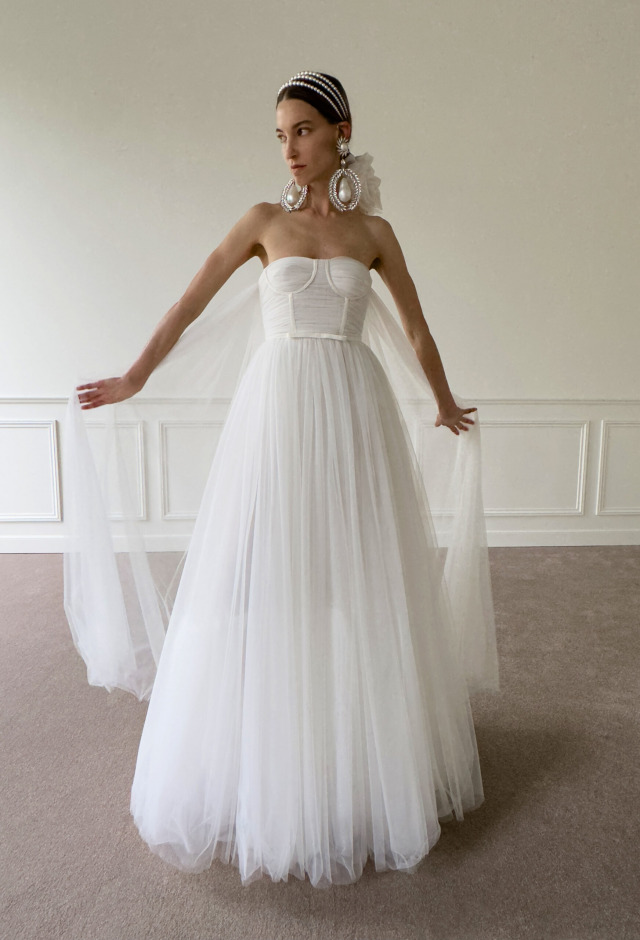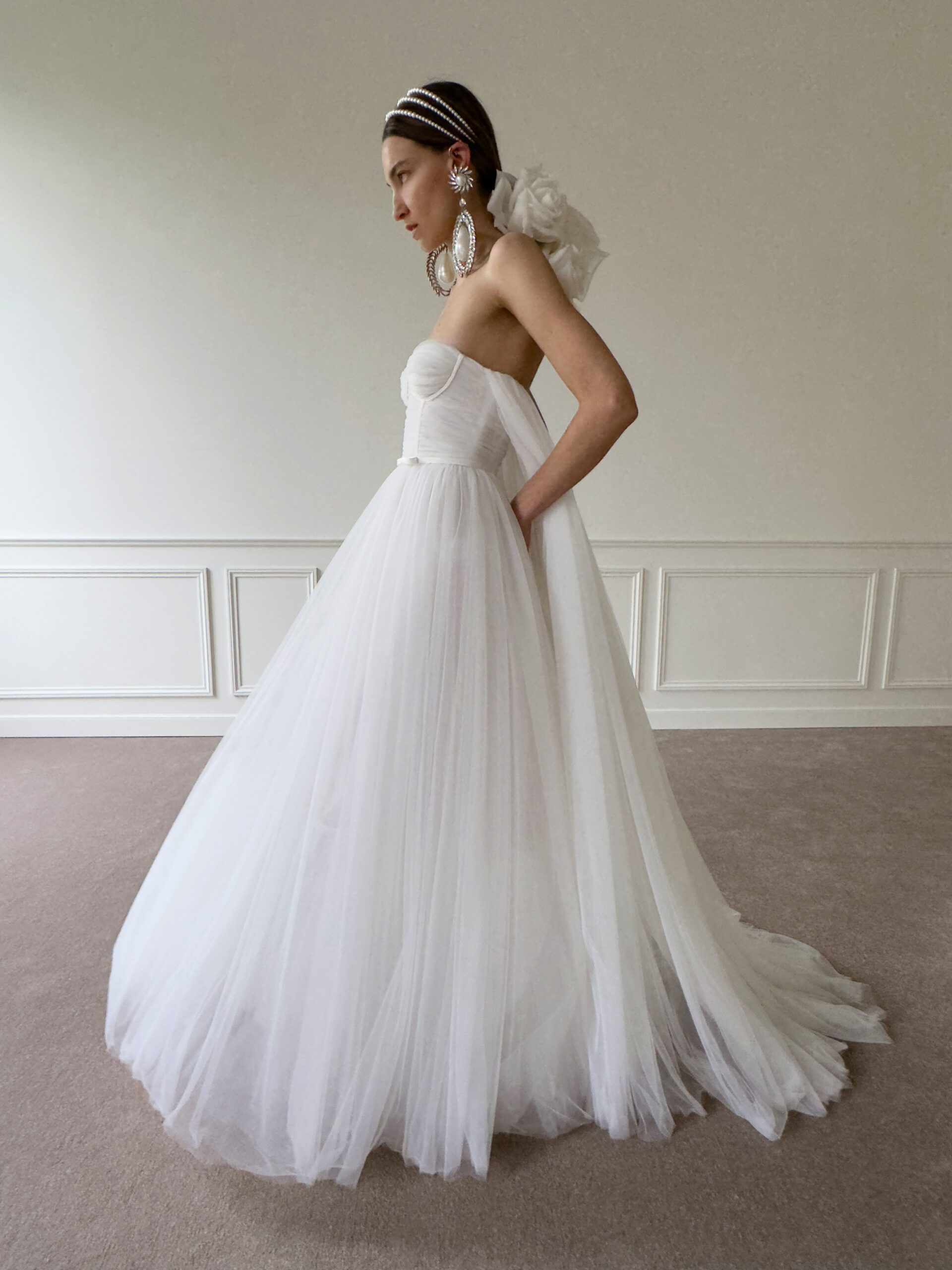 - Giambattista Valli Octubre Wedding DressPrice available on request- Strapless Giambattista Valli tulle dress with a cape/train