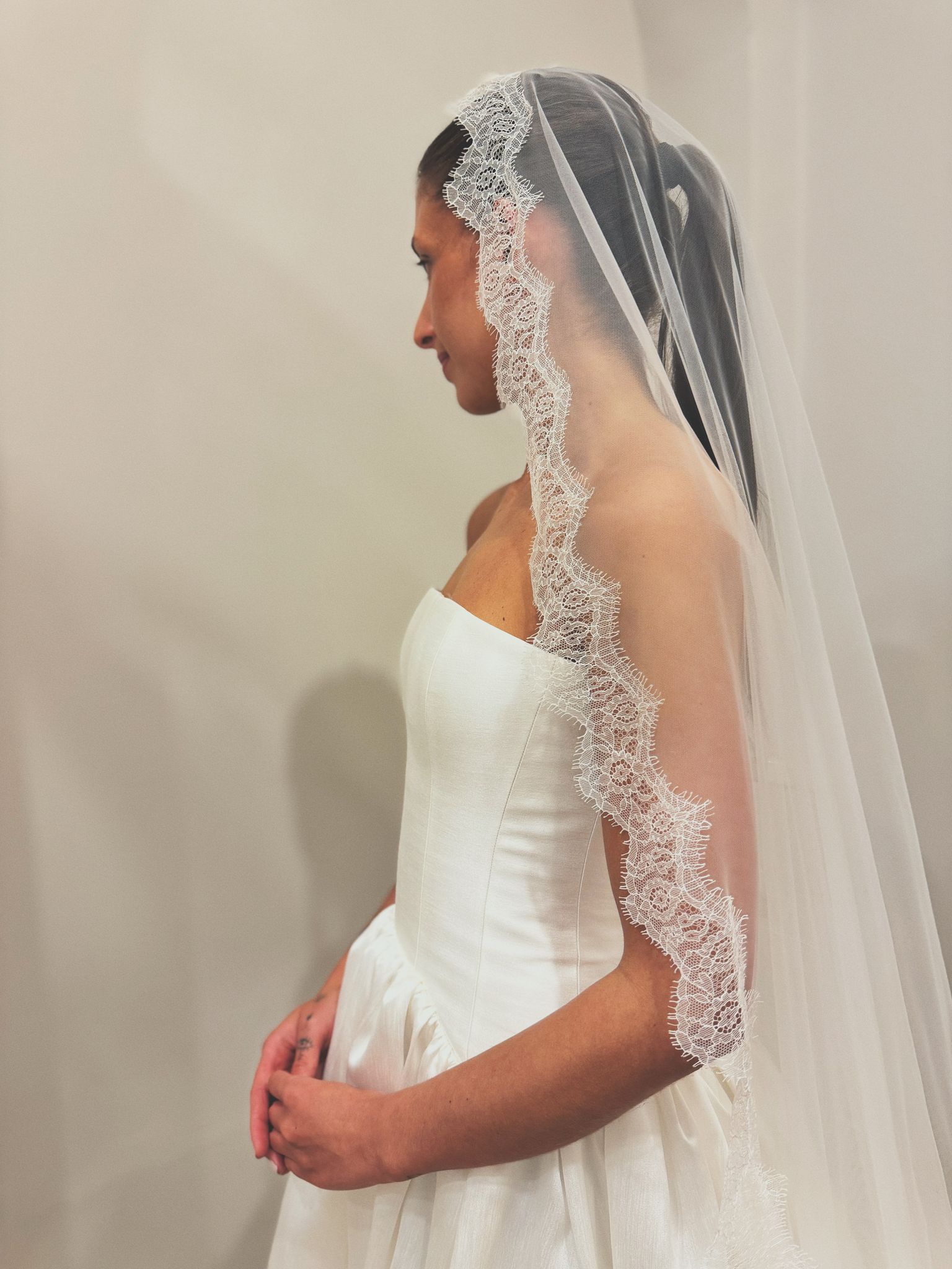 Mantilla style single tier veil with delicate Chantilly lace trim.