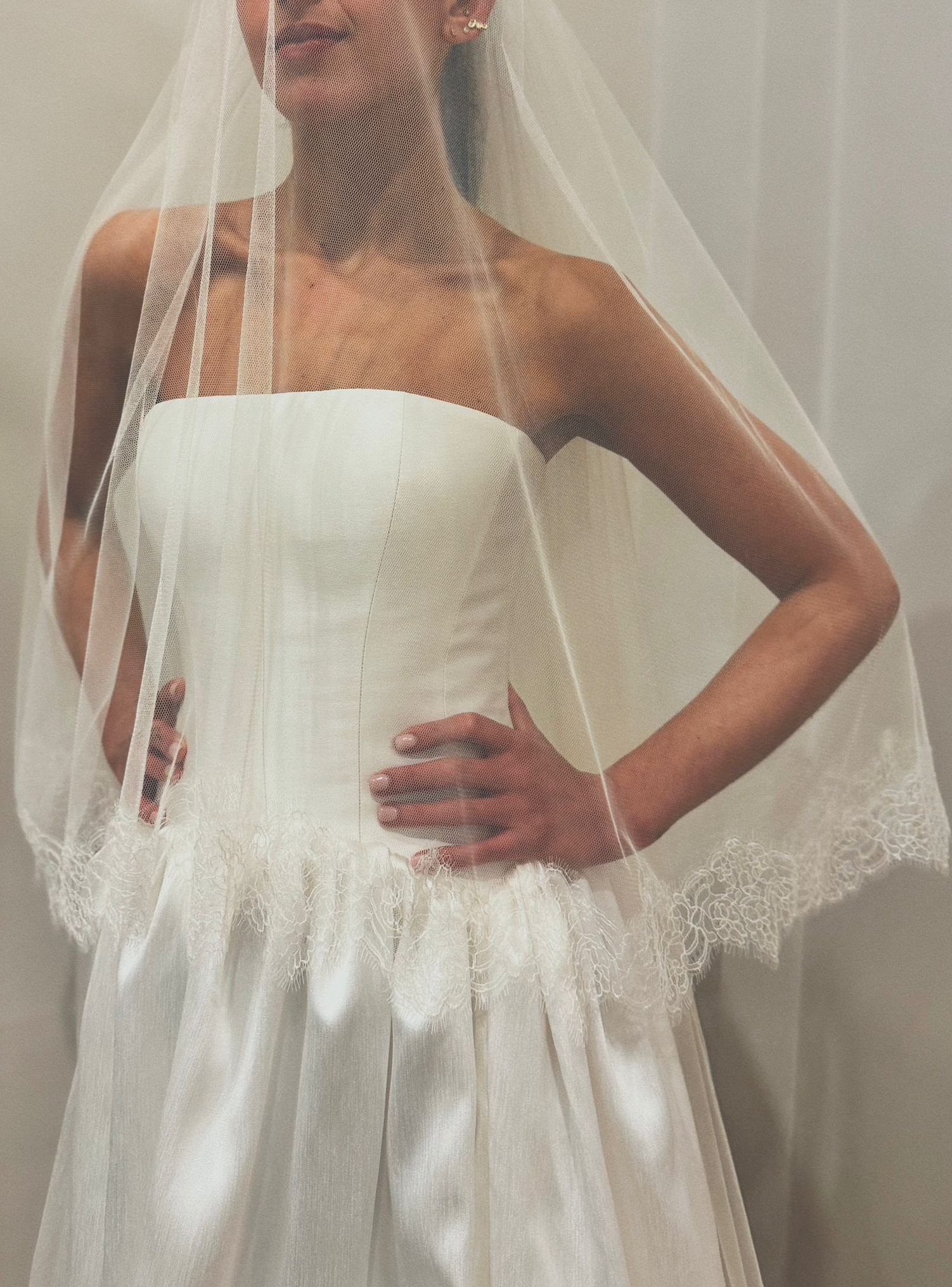 Silk tulle two tier veil with delicate Chantily lace trim.