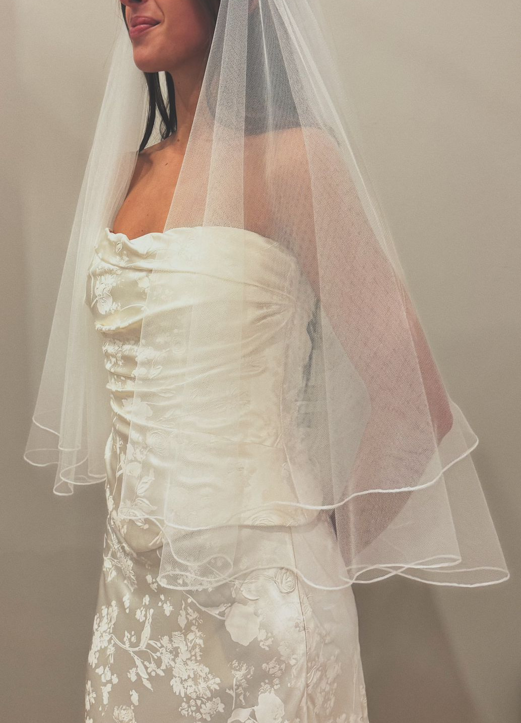 Two tier silk tulle veil custom made in our in house atelier. Fine edge detail for a touch of minimalist detail. Available single or double tier.