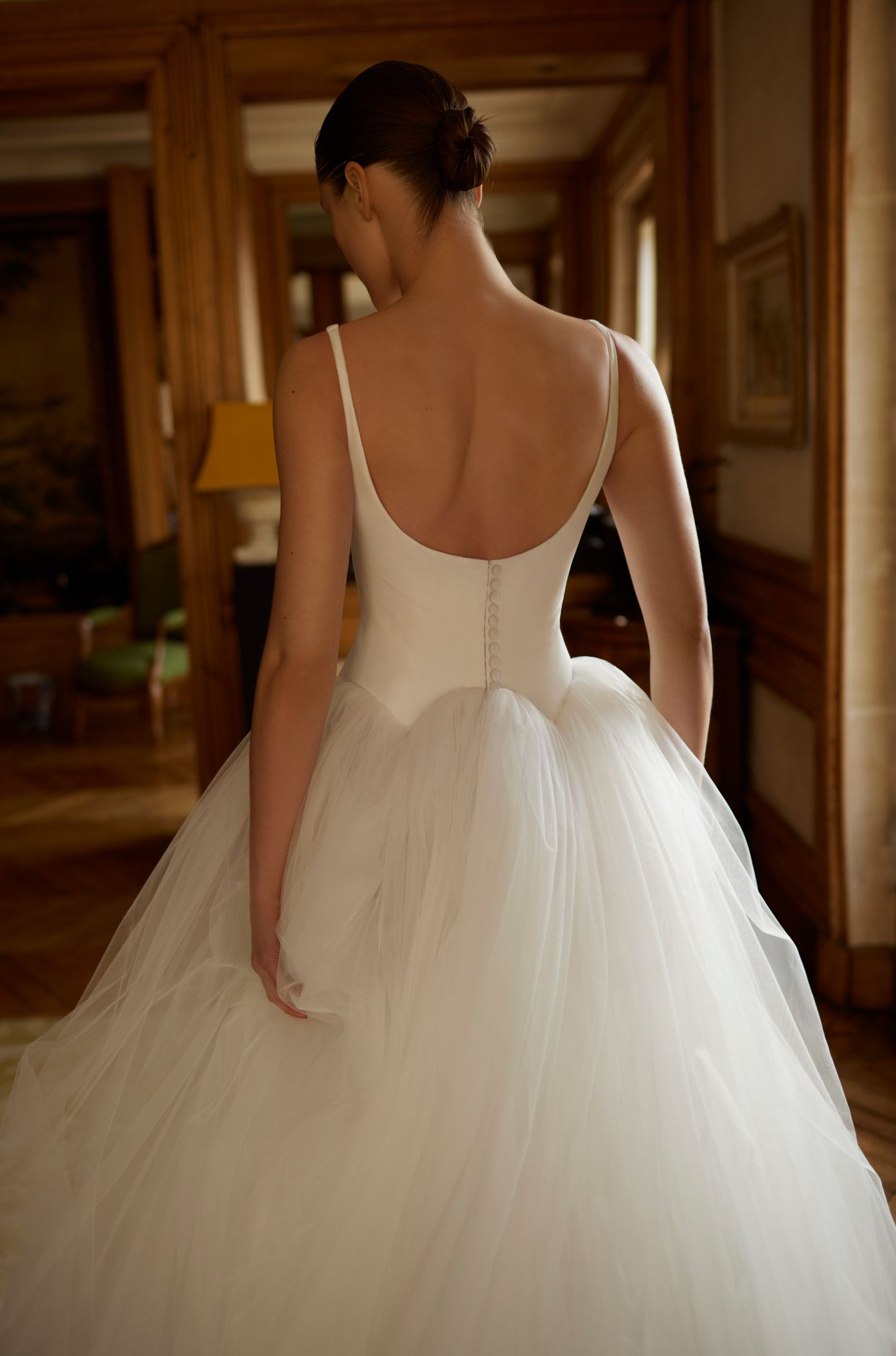 A gown that blends modernity with timeless elegance. The sleek crepe bodice, featuring a structured inner corset and delicate thin straps, create a refined silhouette. A voluminous tulle skirt adds a dramatic flair, while the long train elevates the regal essence of this contemporary take on the classic ball gown.