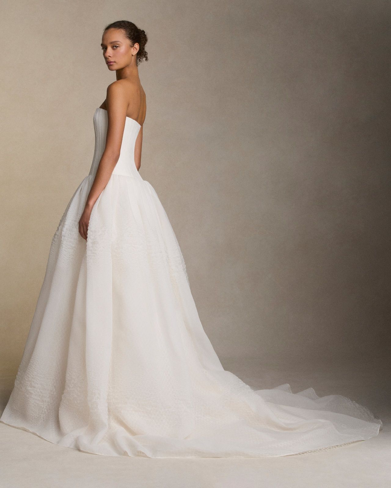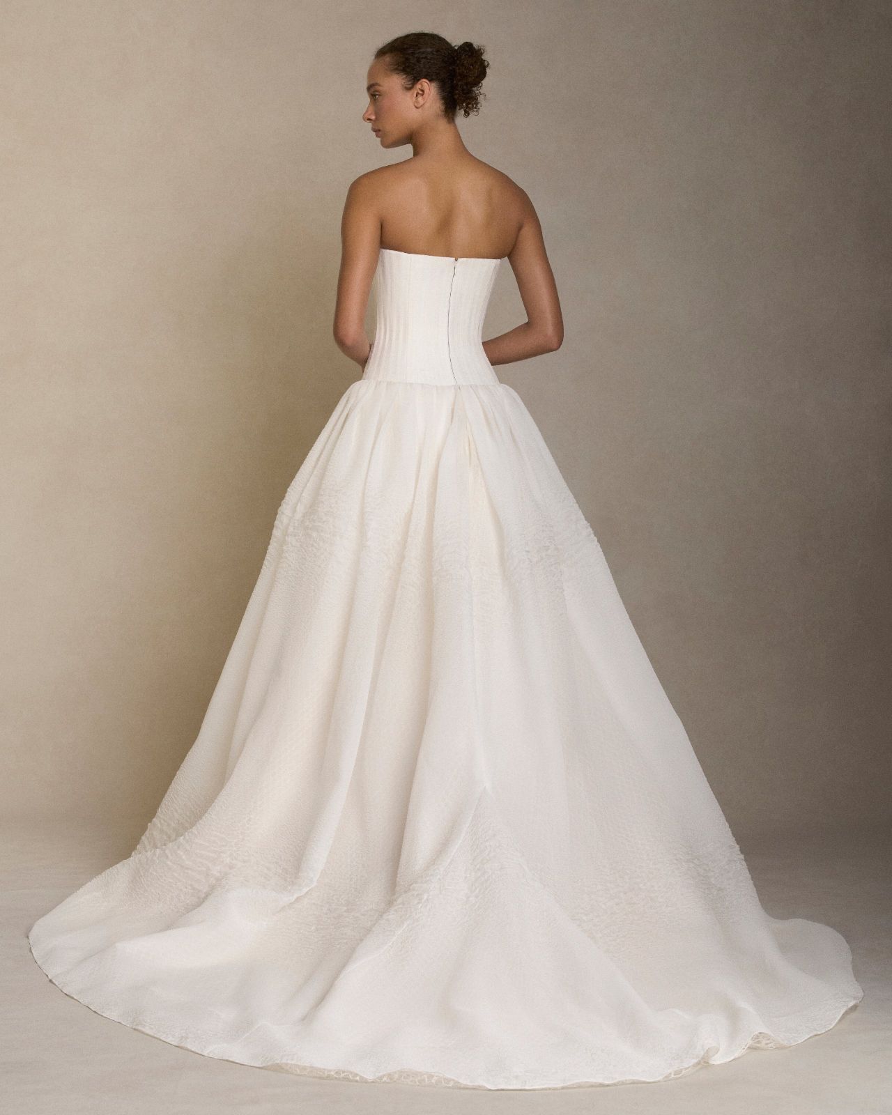 Strapless drop waist silk linen organza ballgown with grosgrain boning detail shaping the bustier. Layered textured cloqué organza drop waist ball skirt with honeycomb lace underlay. Boned internal bustier, internal grosgrain belt and invisible zip closure at centre back.