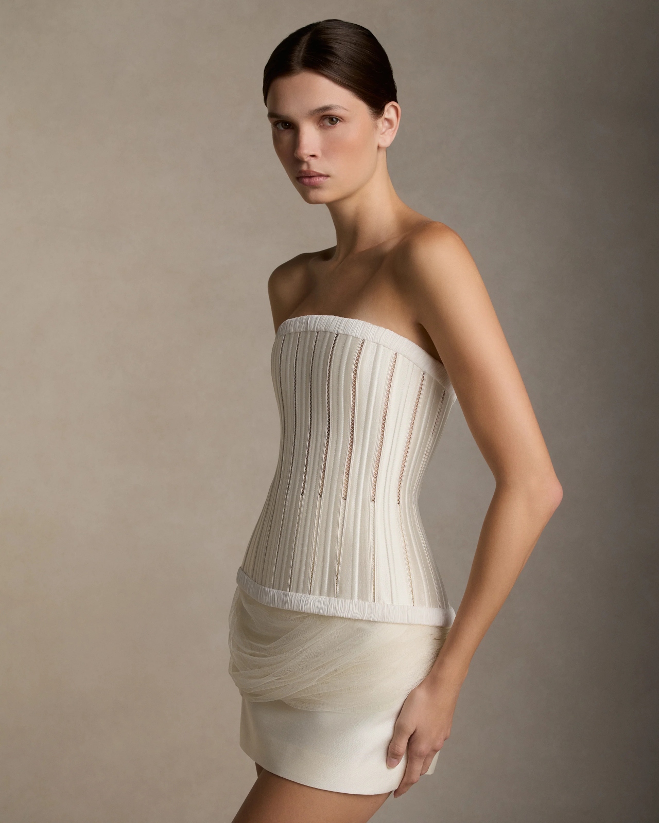 Silk wool twill mini skirt with boned yoke detail. Tulle draping wraps around the waist twisting into an asymmetric train at back. Invisible zip closure at centre back.