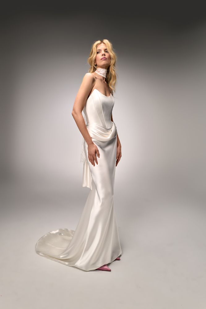 Strapless Charmeuse Corset Gown with with Sculptural Draped Hip Peplum