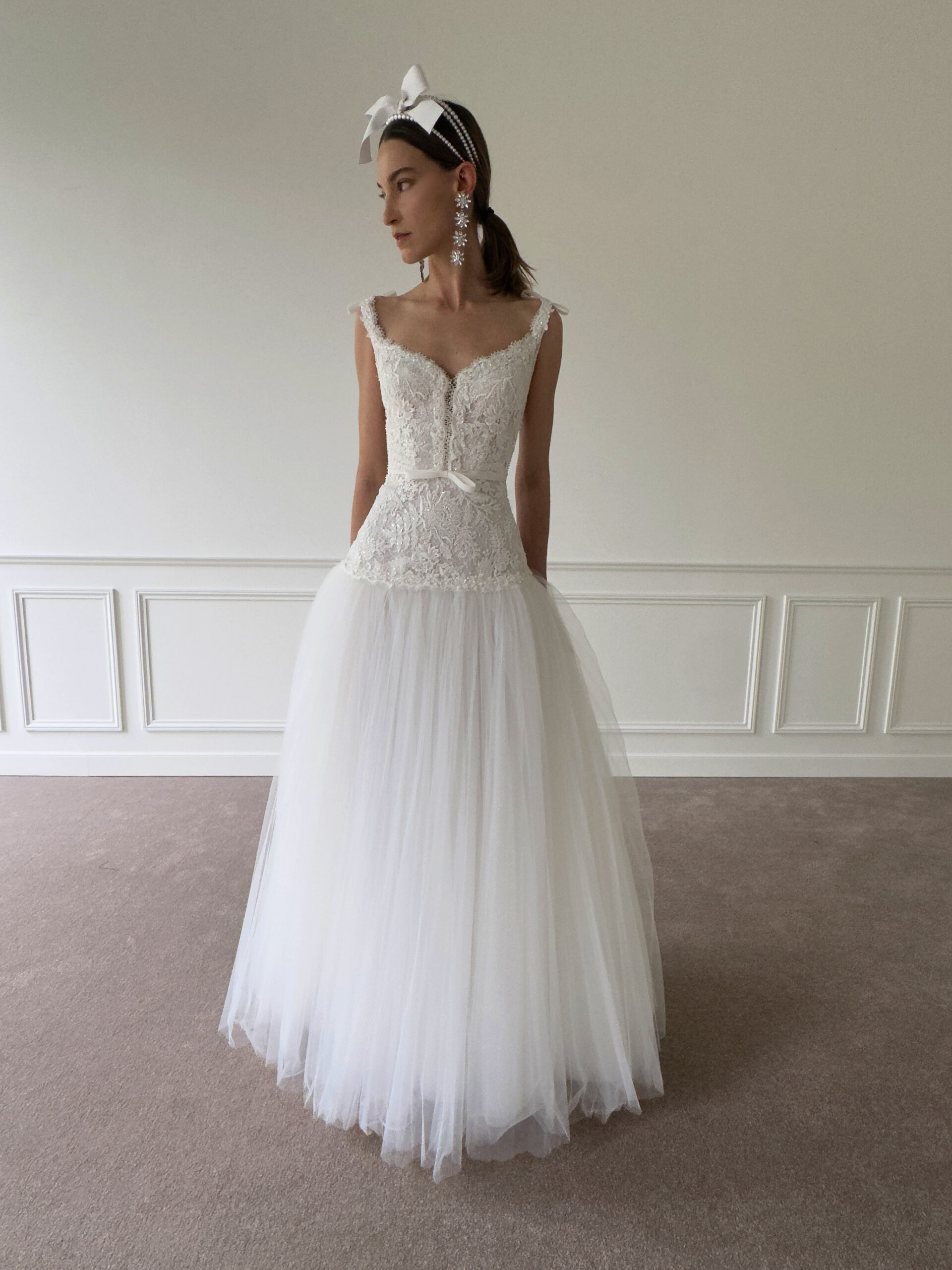 Tank-style dress with an embroidered lace bodice and a multi layered tulle skirt