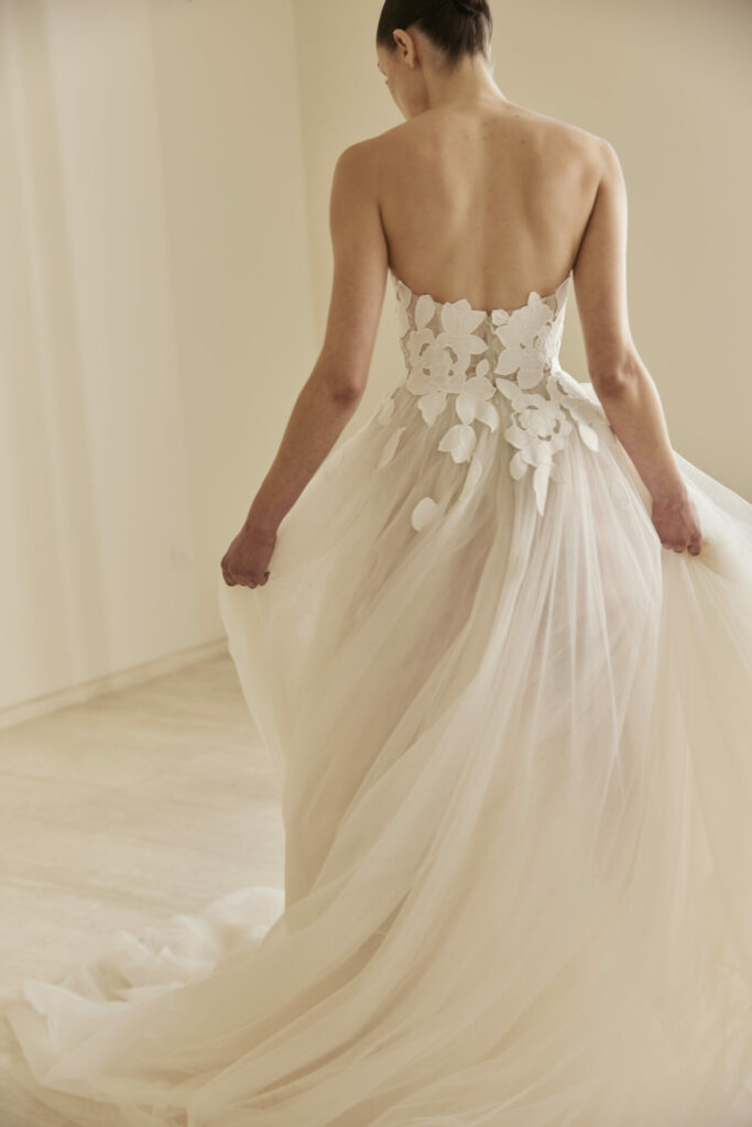 A striking deep sweetheart corset shapes the bodice of this gown, offering structure with a soft romantic edge. The gently dropped waist elongates the silhouette and transitions seamlessly into a voluminous skirt crafted from layers of rich, airy tulle. Bold Mikado floral appliqués bloom across the bodice and cascade softly, adding sculptural elegance and refined texture.