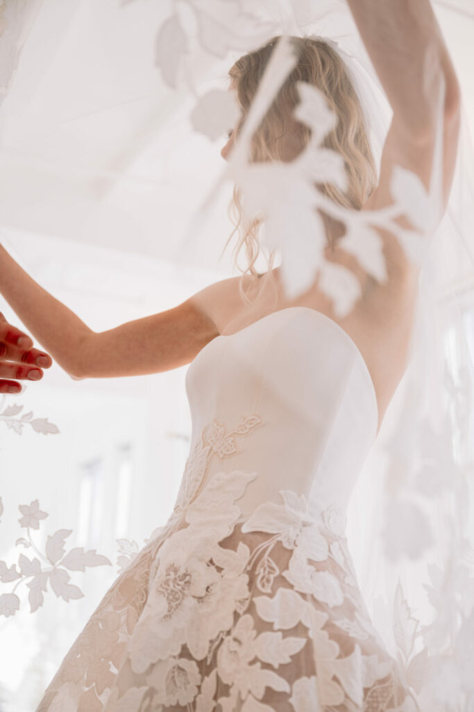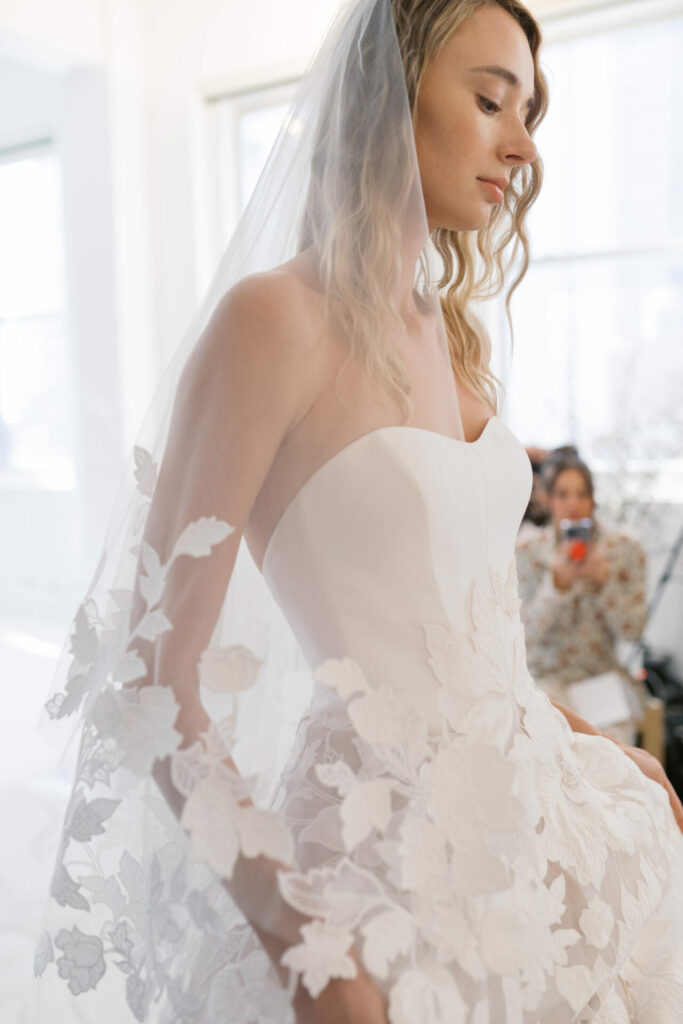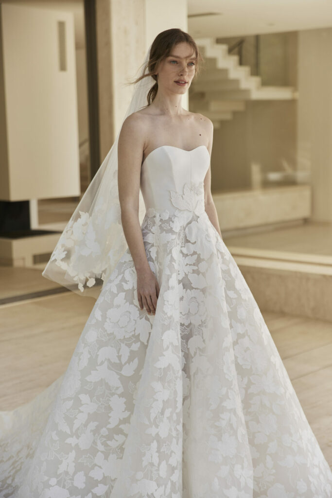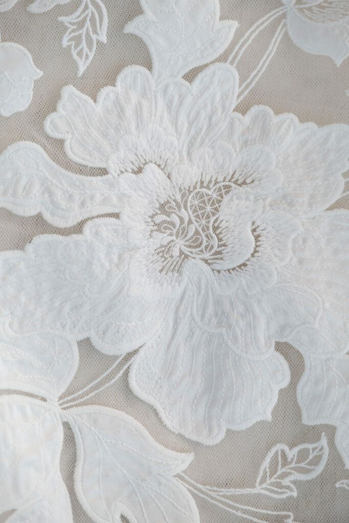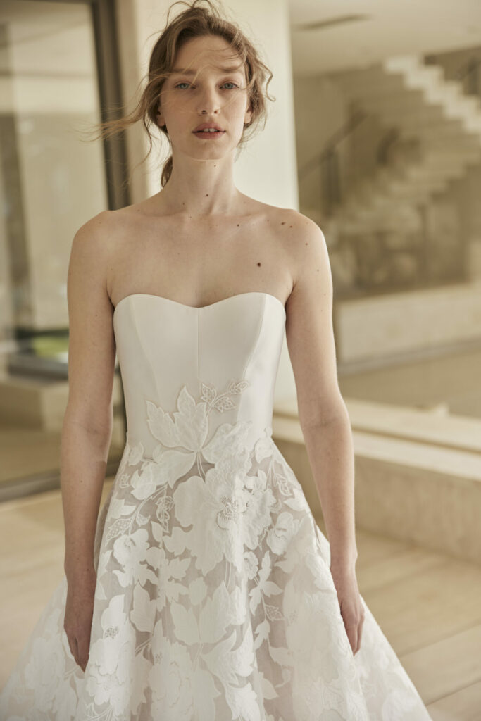 A modern romantic gown that pairs a structured plain silk corset with a voluminous skirt of embroidered cotton florals, offering a light, airy silhouette that blends minimalist elegance with rich, artisanal detail. Perfect for brides who love clean lines with a touch of unique texture.