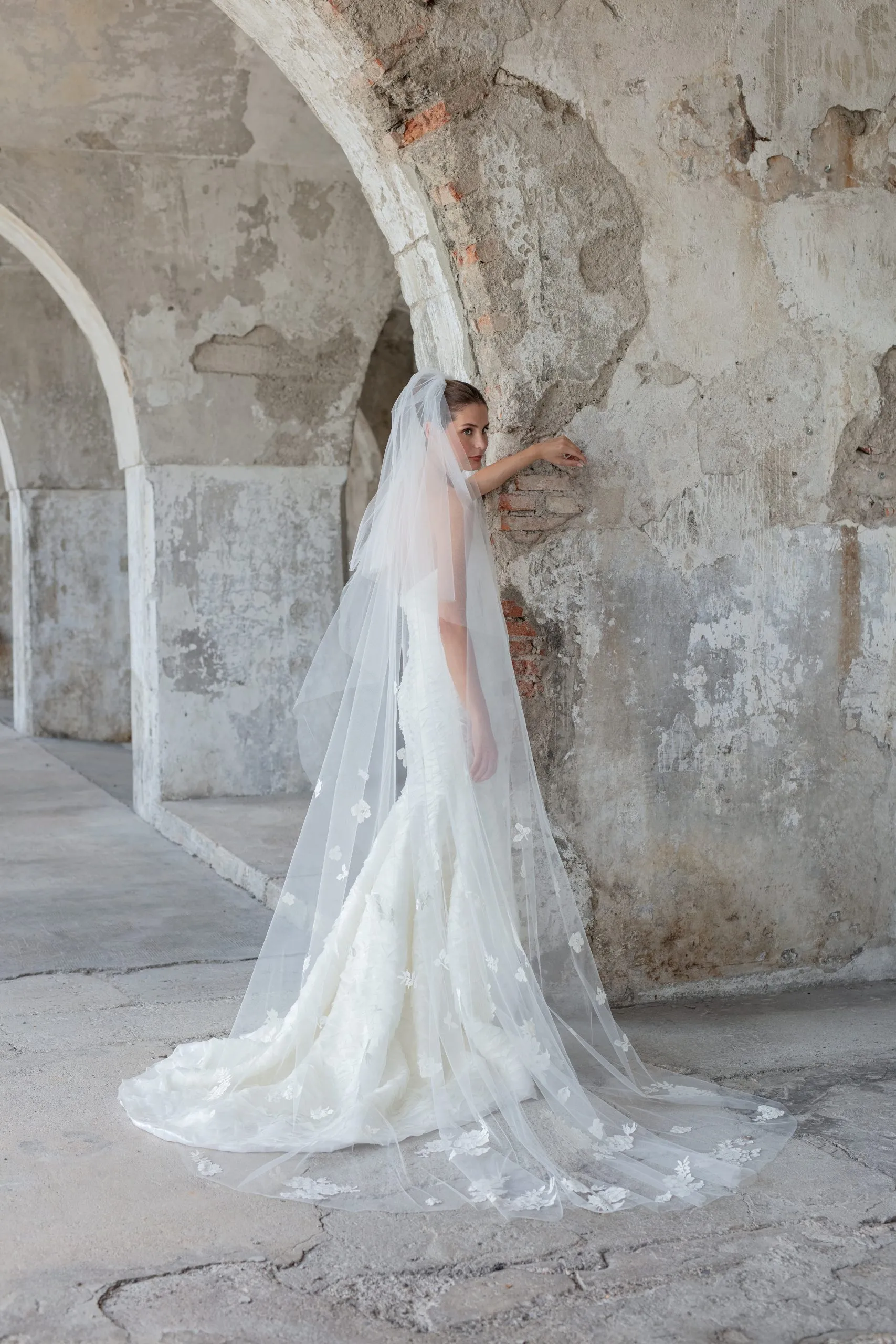 Made of tulle, with blusher, it is embellished with Chantilly lace appliqués placed in random order over the length.