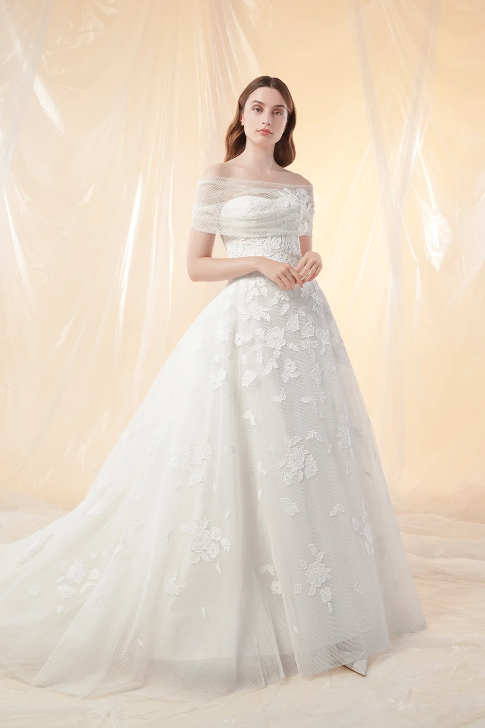 The voluminous ball gown silhouette adds a fairy-tale elegance, perfect for the bride dreaming of a timeless, show-stopping gown for her special day.