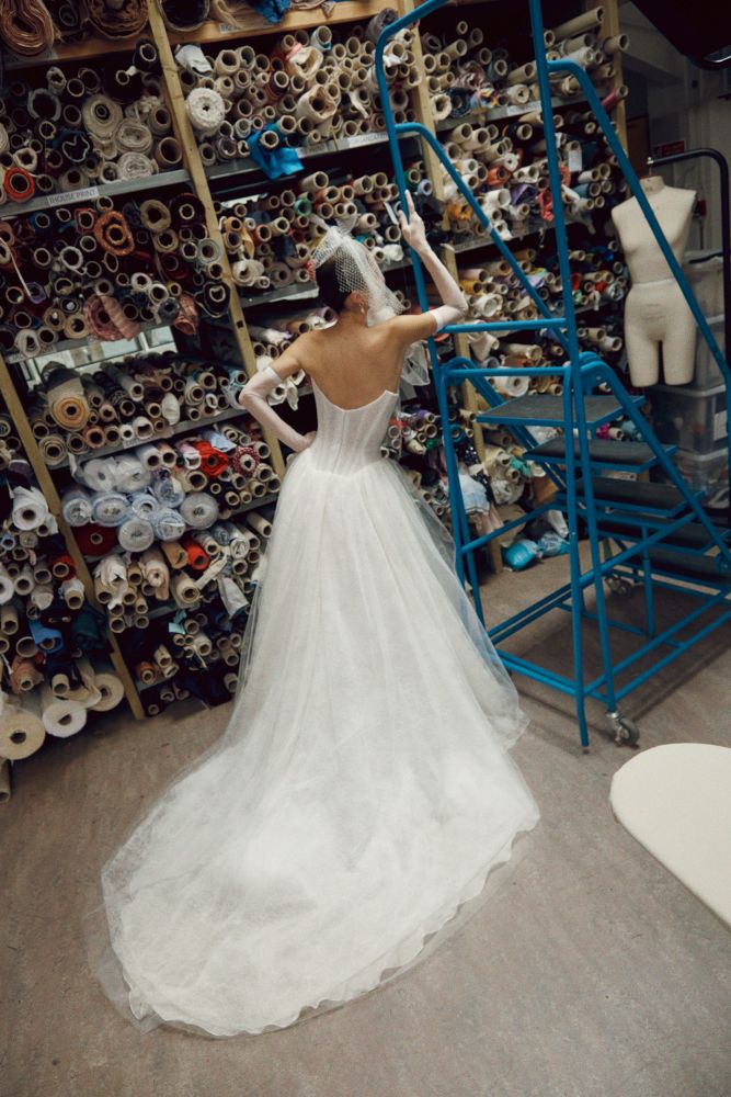 The Darling dress weaves together influences from the Marie Antoinette gown of the 2021 Bridal Couture collection, and the Chichi dress from the Spring-Summer 2025 collection. Crafted for the modern bride, its silhouette is rich in intricate construction. A twisted drape graces the bust, forming a soft sweetheart neckline, while a dropped waist corset gently sculpts the hourglass figure. The multi-layered tulle skirt floats like a delicate cloud, both ethereal and light. Offered in tulle layered over fine Chantilly lace or in the Presence of Blooms printed tulle, the gown evokes the romance of a secret garden in full bloom.