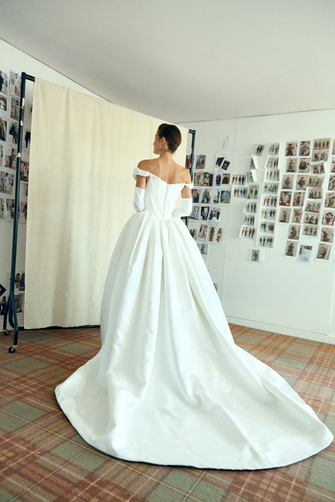 Inspired by the Court dress of the Spring-Summer 2012 collection, ‘War and Peace’, renowned for its exaggerated, armour-like corset, the Lady gown draws from the grandeur of the Second French Empire. The elongated silhouette and tightly cinched basque waistline celebrate couture craftsmanship, highlighting impeccable proportions and exquisite detailing. The off-shoulder neckline is delicately gathered using the Westwood ‘bubble’ pattern technique, while V-shaped yokes define the waist. The skirt unfolds in a sumptuous cascade of fabric, marrying sculptural drama with refined, romantic elegance.